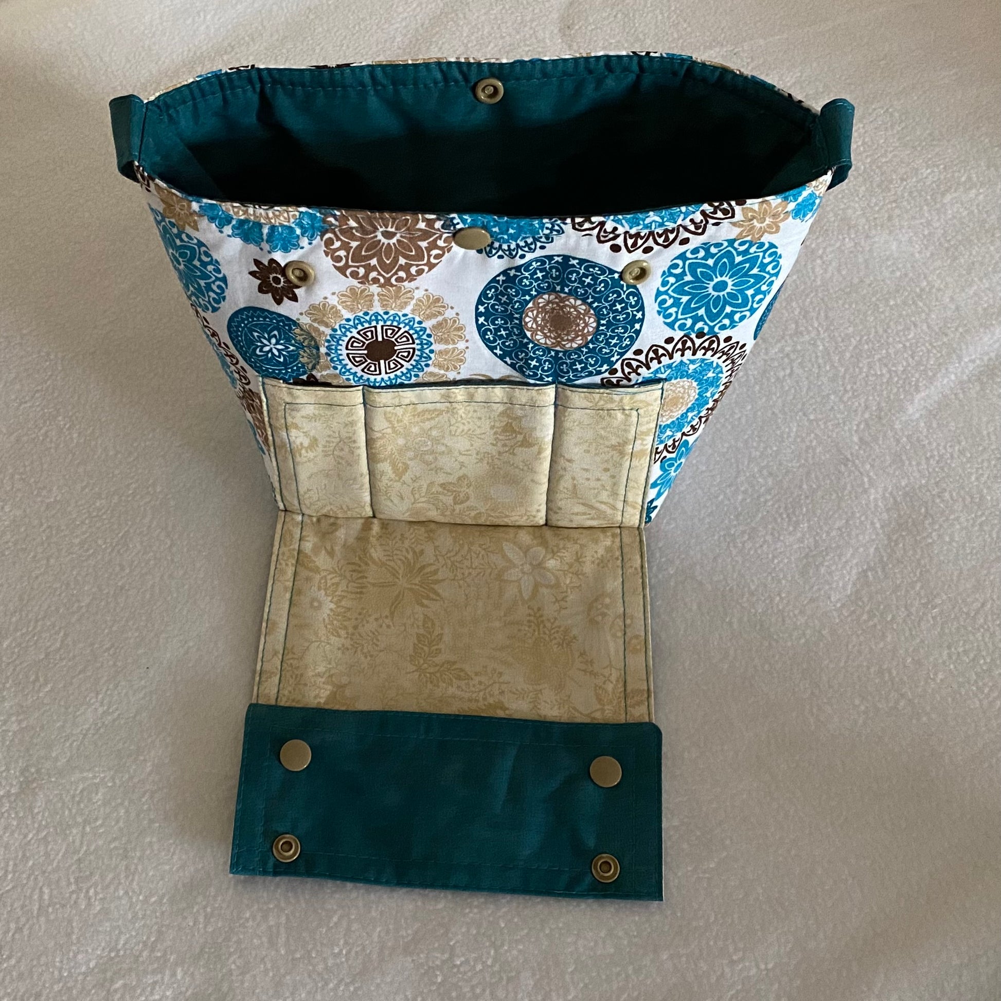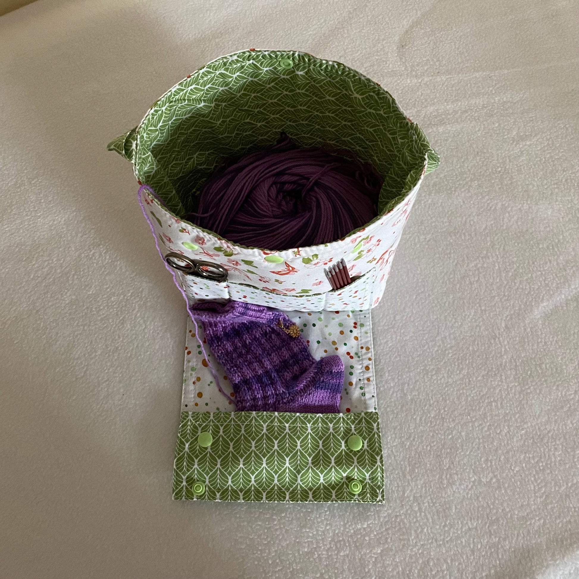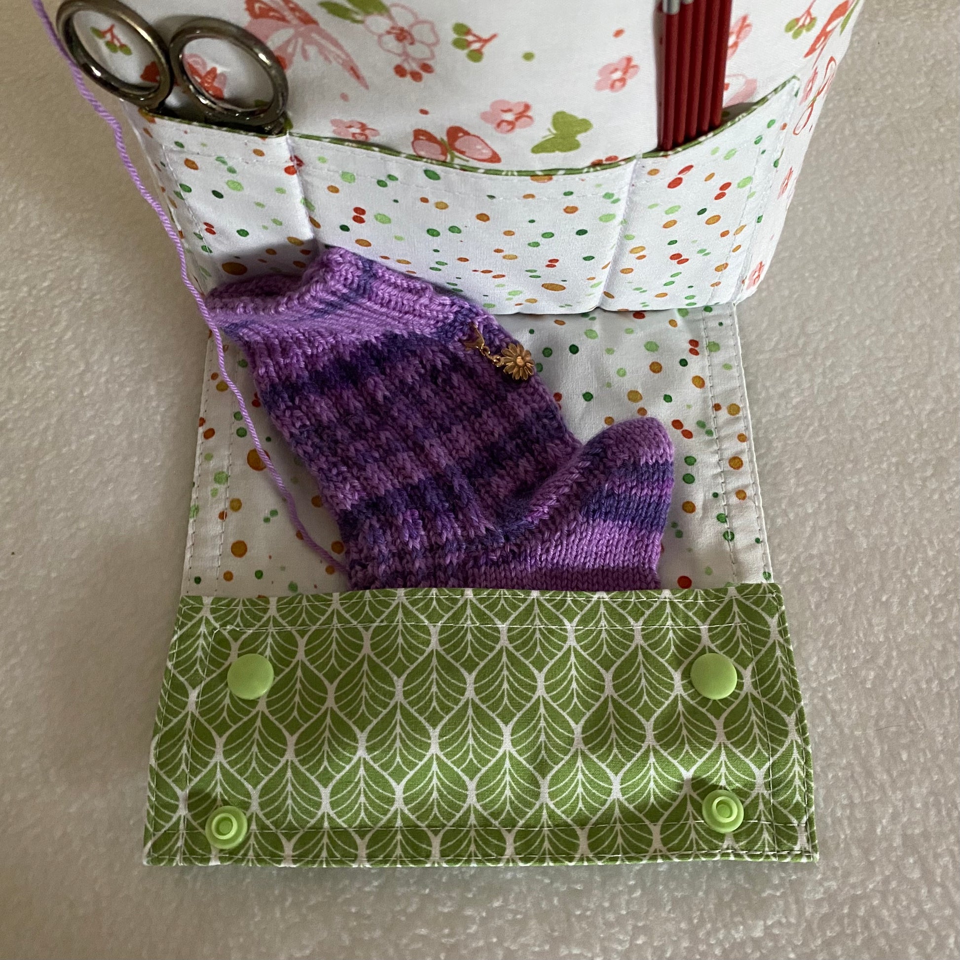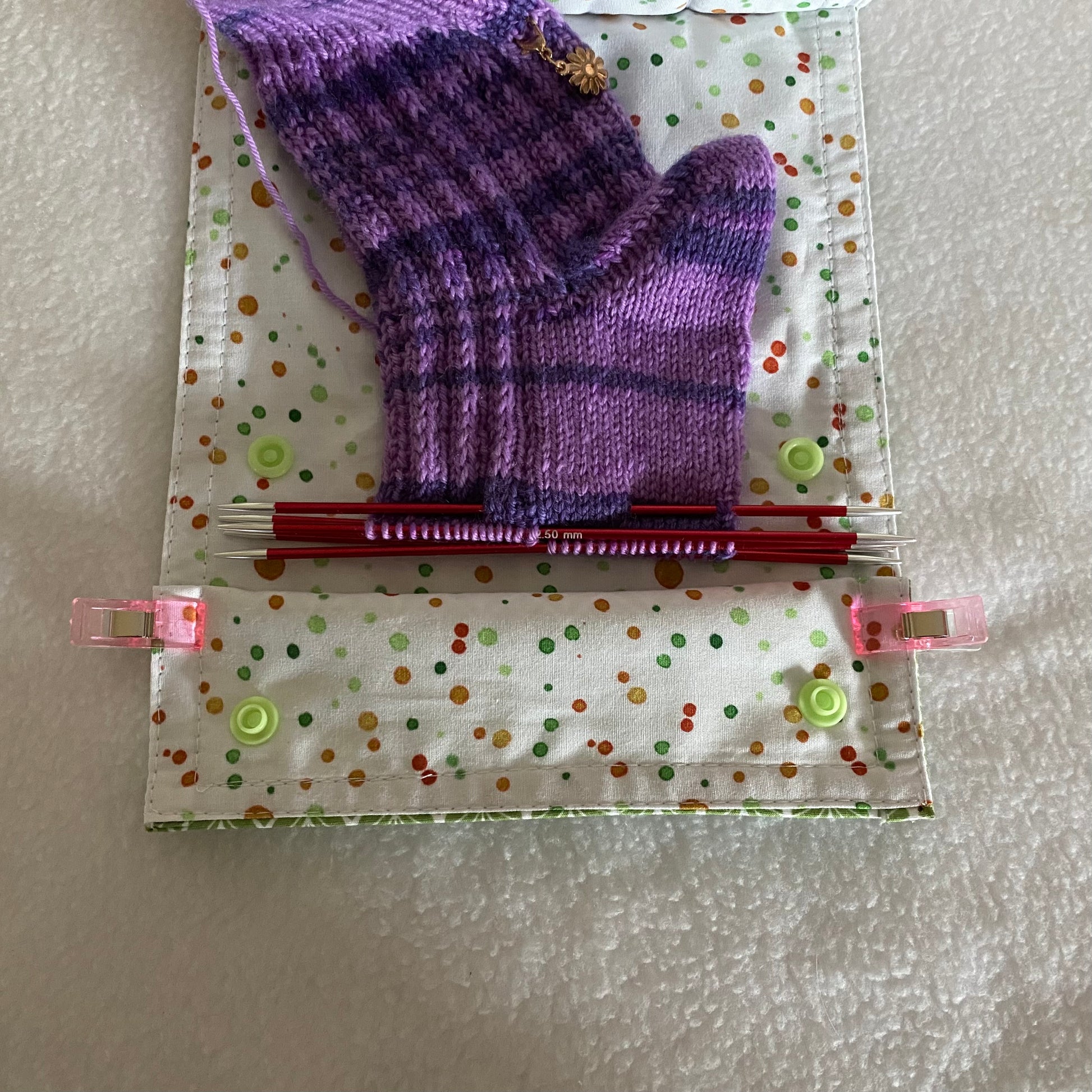 Die Tasche bietet Platz für Sockenwolle und Socken. Hinter der vorderen Klappe verbirgt sich eine Nadelgarage zum sicheren verstauen der angefangenen Socken. Zudem gibt es noch 3 kleine Steckfächer für weitere Nadeln, Schere etc.