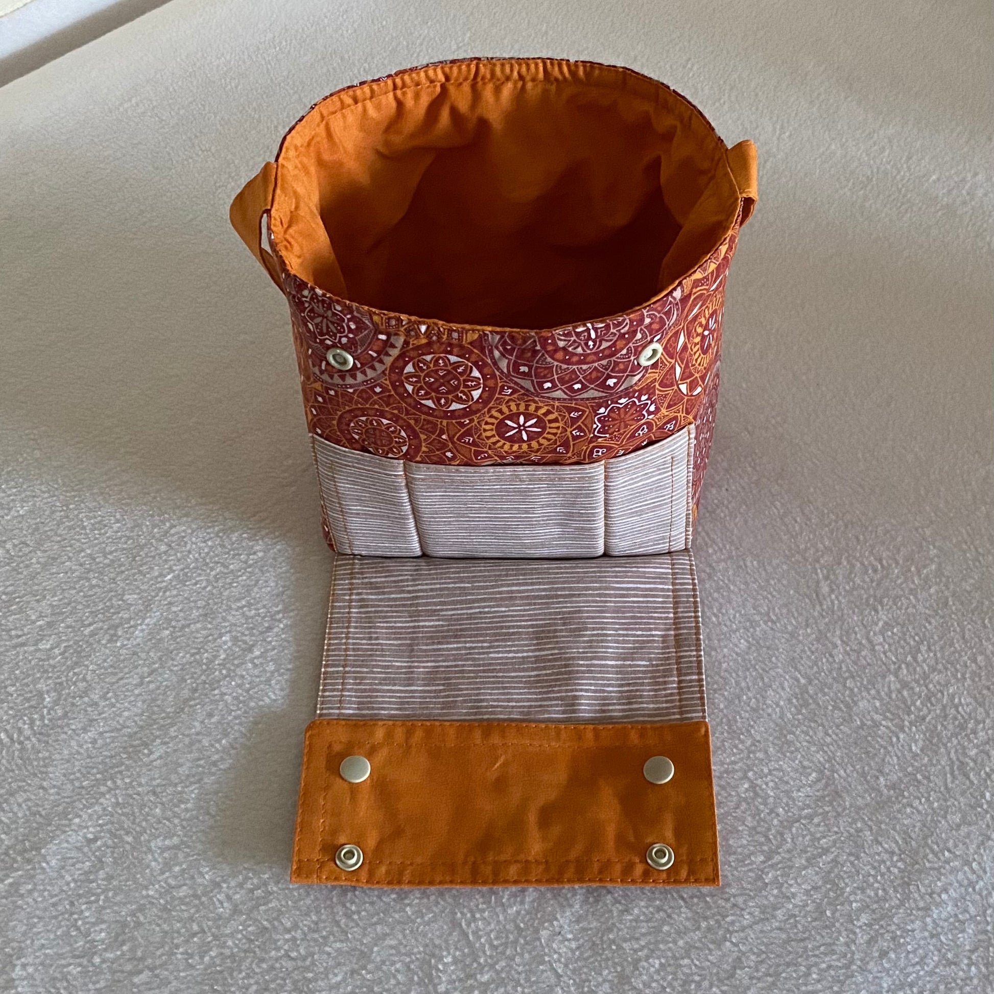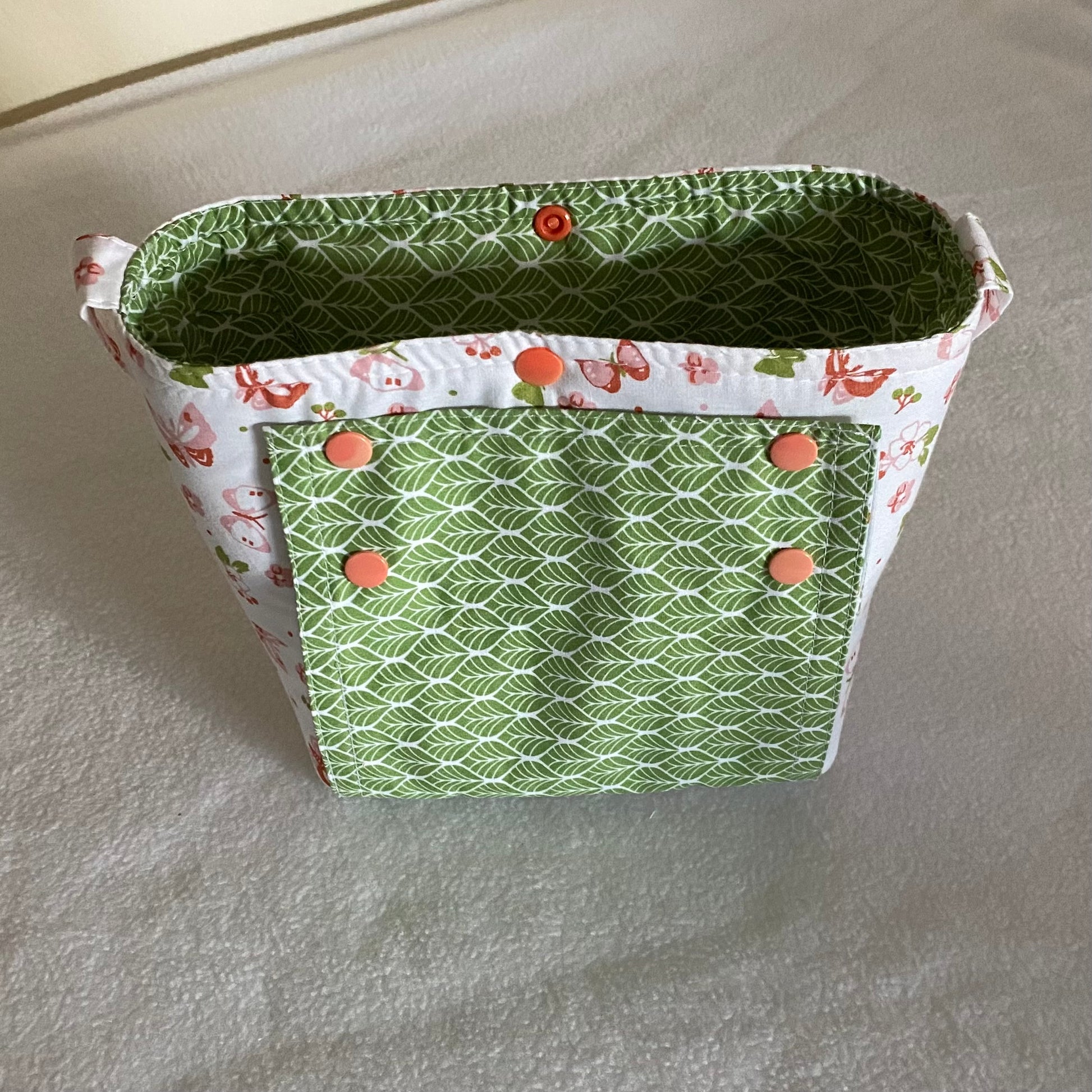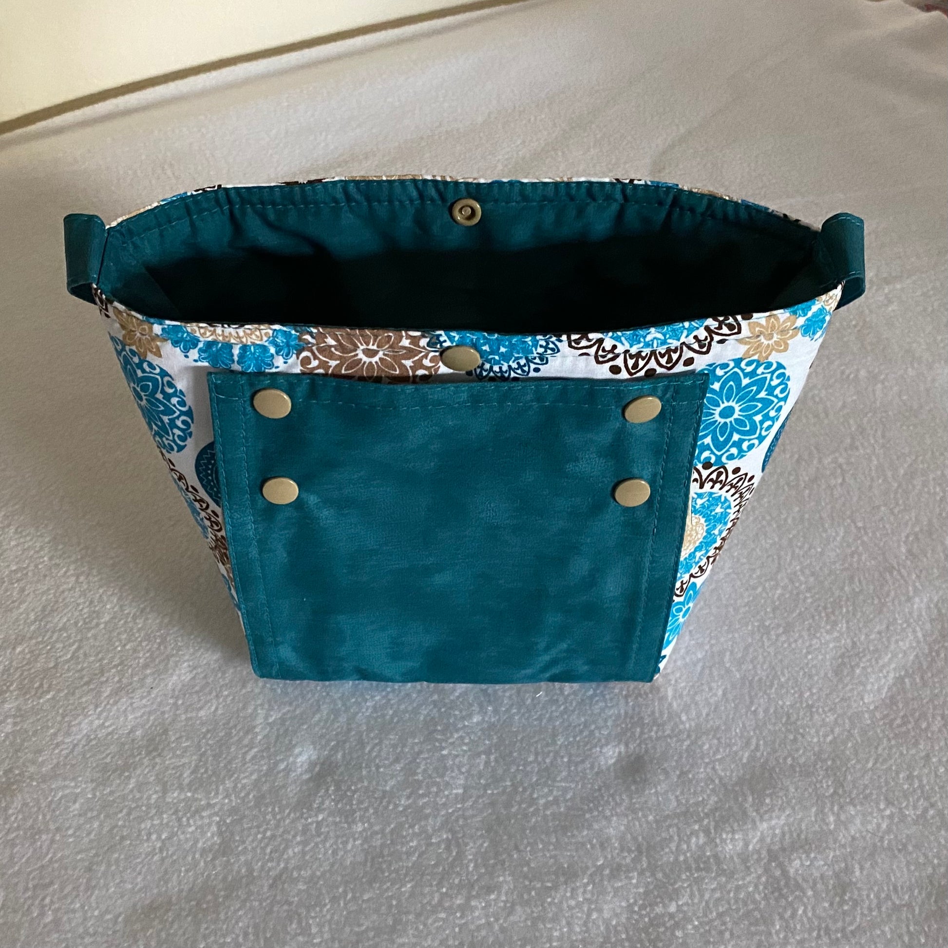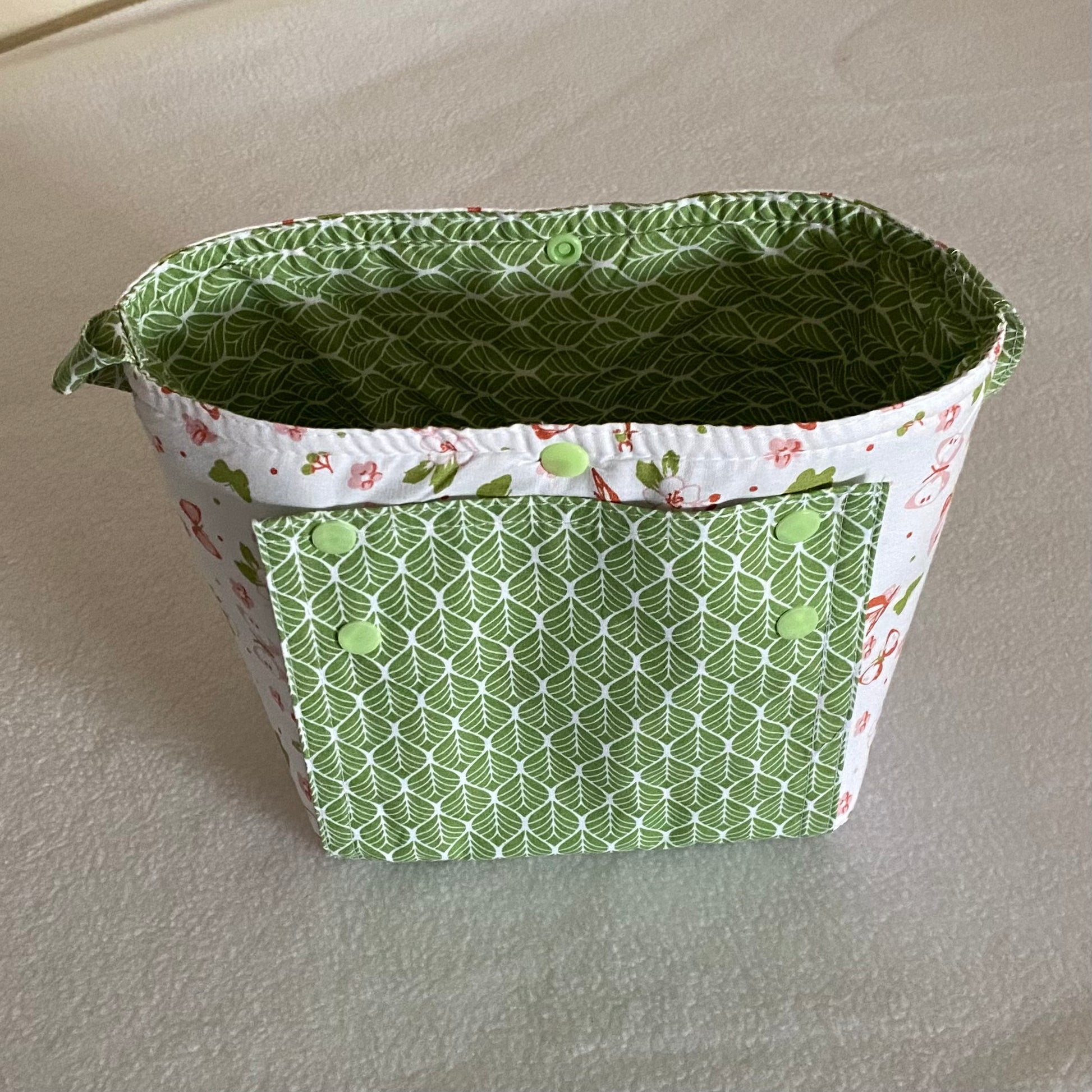 Die Tasche bietet Platz für Sockenwolle und Socken. Hinter der vorderen Klappe verbirgt sich eine Nadelgarage zum sicheren verstauen der angefangenen Socken. Zudem gibt es noch 3 kleine Steckfächer für weitere Nadeln, Schere etc.