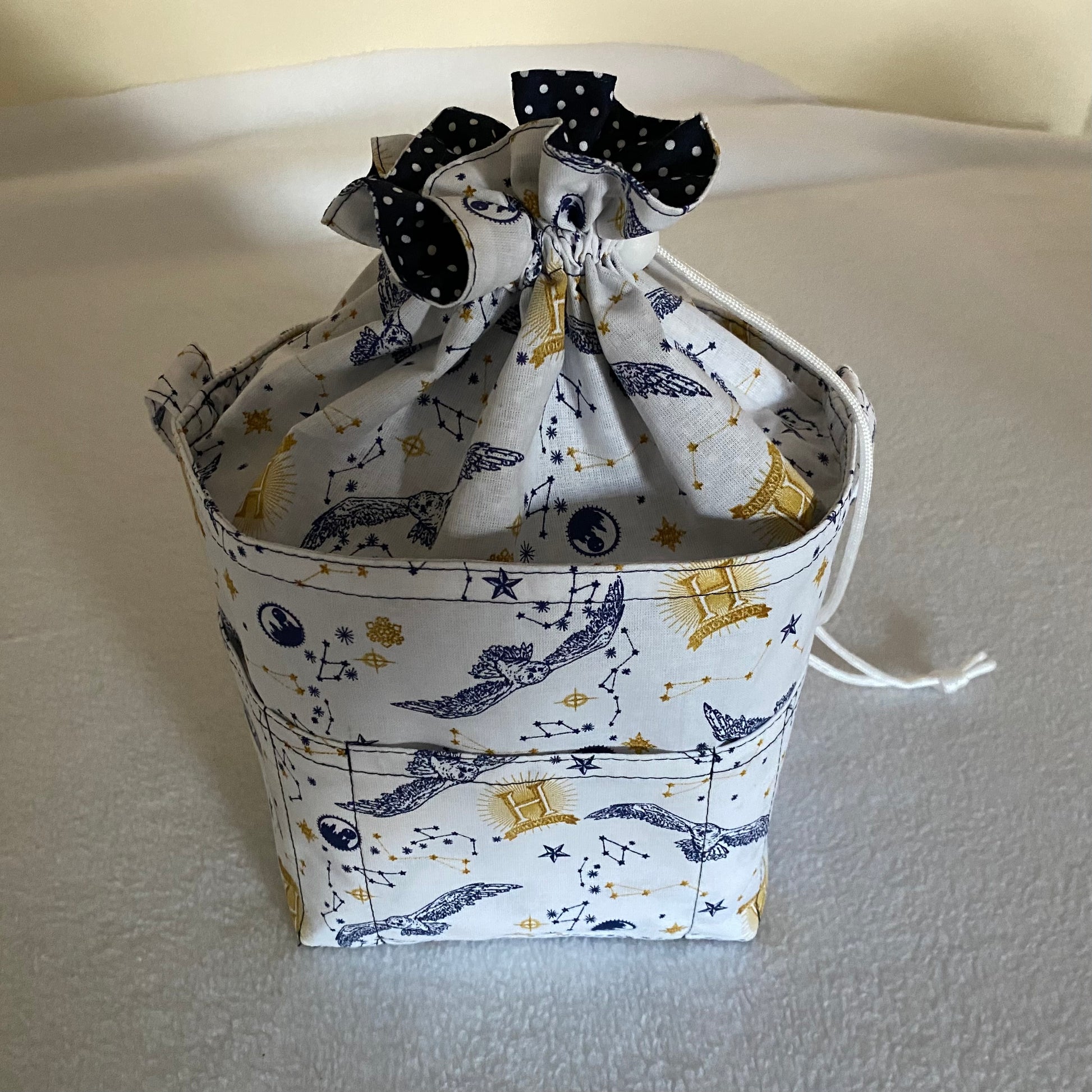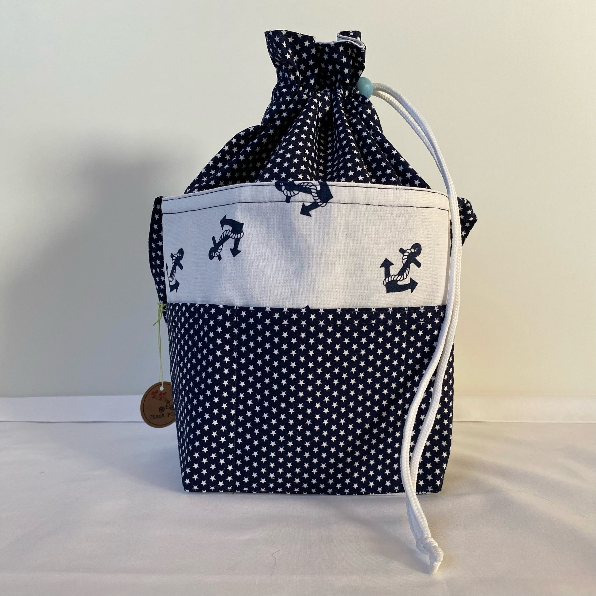 Der Bobbel kann direkt aus der Tasche heraus verarbeitet werden und ist auch in den Pausen gut darin aufgehoben. In der Fronttasche ist genug Platz für Nadeln und Zubehör und durch das Zugband kann dem Bobbel auch unterwegs nichts passieren.