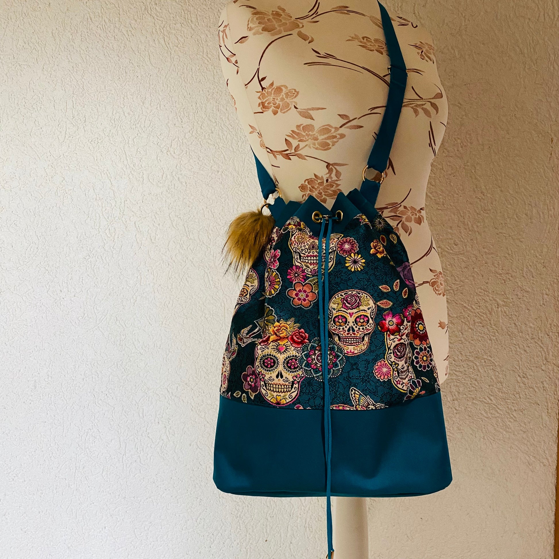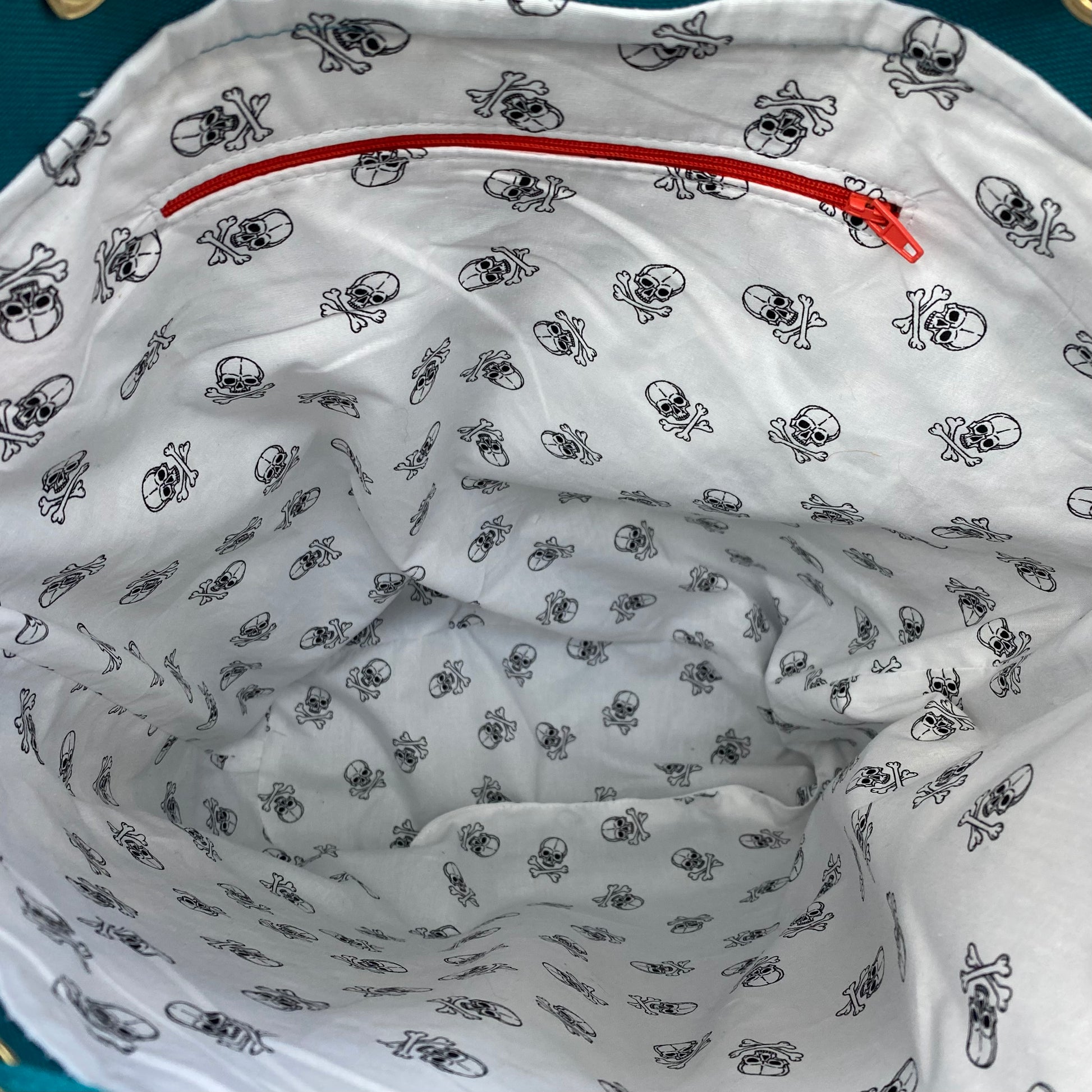 Trendiges Bucket Bag aus Gobelin in türkis. Innenfutter mit Reißverschlusstasche in weiß mit schwarzen Skulls.